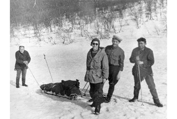 Транспортировка к вертолётной площадке, оборудованной на перевале, одного из трупов, найденных в феврале-начале марта 1959 г. Фотография из коллекции Алексея Коськина и «Фонда памяти группы Дятлова», общественной организации, много сделавшей для изучения обстоятельств трагедии 1959 г. на перевале. Для нас этот снимок особенно интересен тем, что сделан в непосредственной близости от верхней границы леса, каковой она была во время описываемых событий. Видно, что поросль карликовых берёз резко обрывалась, открывая совершенно голый склон без всякой переходной кустарниковой зоны. Граница лесной зоны в 1959 г. проходила на высоте примерно 700 м. над уровнем моря. За истекшие десятилетия, по свидетельству очевидцев, она существенно поднялась по склонам гор, что, возможно, объясняется объективным потеплением климата в северном полушарии.