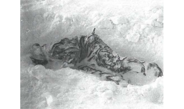 Вид палатки «дятловцев». Знаменитая, если не сказать, хрестоматийная фотография спасателя Вадима Брусницына. Обычно этот снимок датируется 28 февраля 1959 г., но сам автор фотографии считает, что она сделана 26 февраля. На переднем плане поисковик Коптёлов, активный участник розыскной операции.