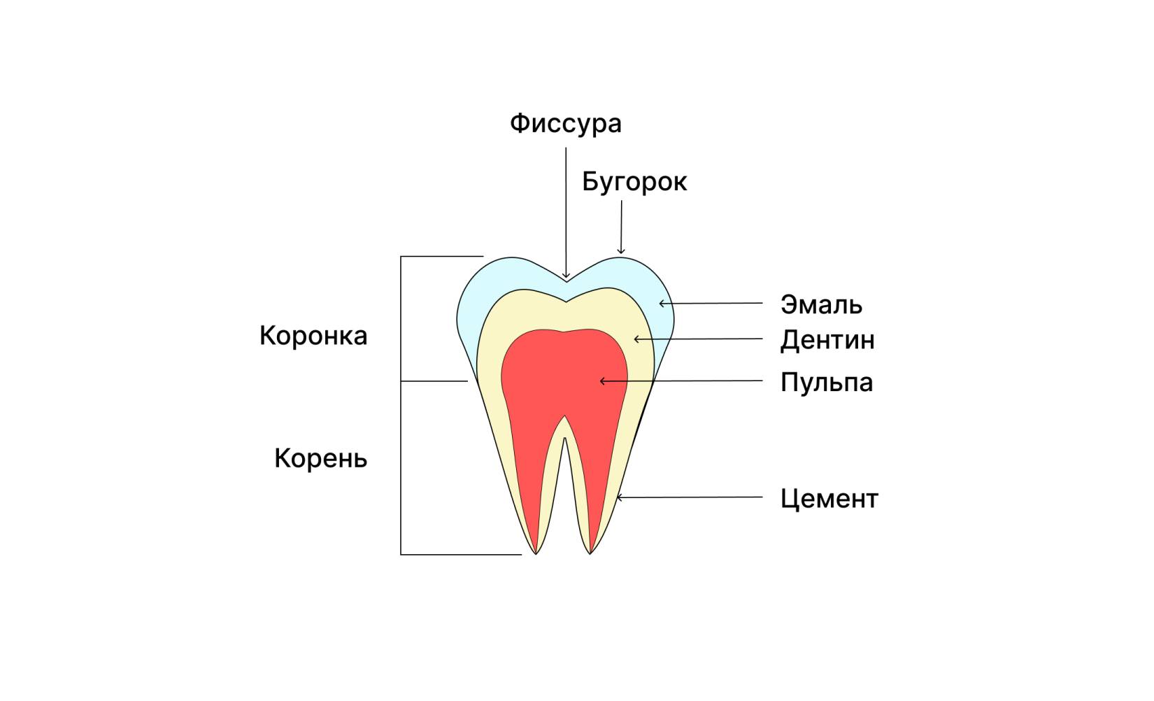 Каждый зуб состоит из нескольких основных частей: