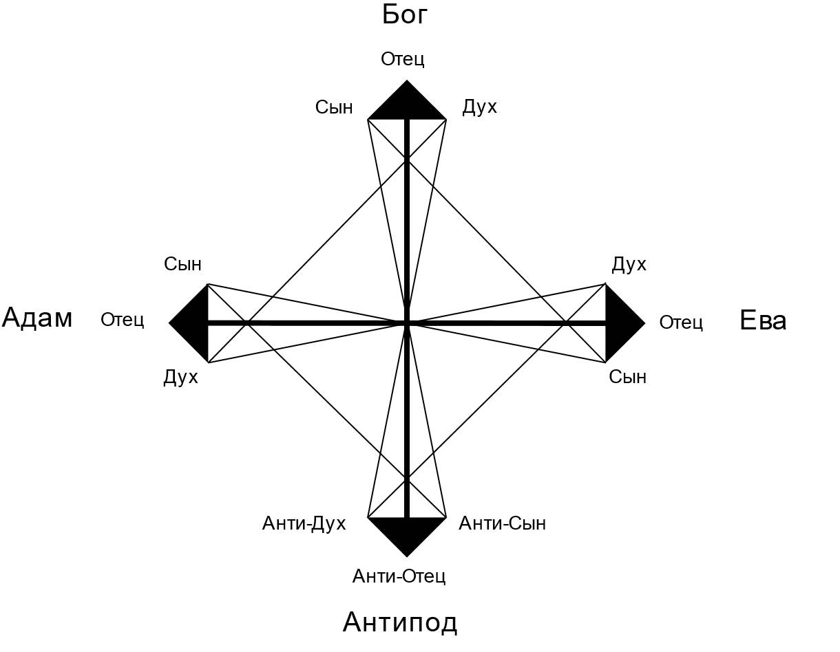 – Антимира, – подсказал Учитель, – схема идеального Хаоса. Линия «Адам – Ева» оказывается слишком близко к Антиподу, подняться к Свету человеку не дает Голем («Анти-Адам – Анти-Ева»), при этом сам Антипод напрямую соединяет Адама с Анти-Евой, а Еву – с Анти-Адамом и сам контролирует эти связи.