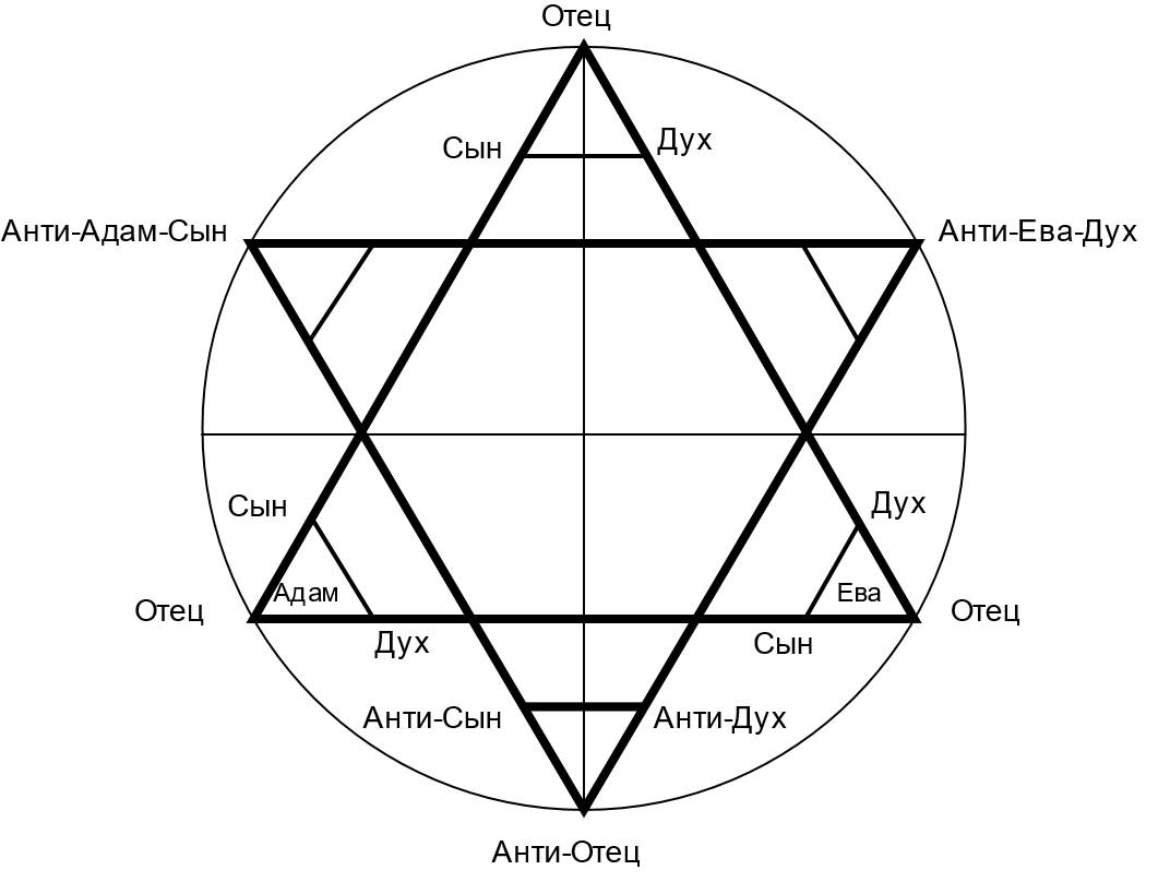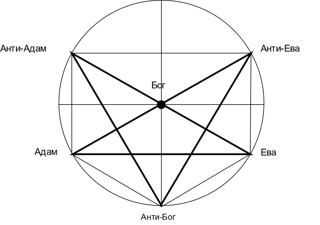 Правый треугольник получил имя Ева, левый, соответственно, – Адам, а нижний, вдобавок к эпитетам Ад и Антипод, обзавелся Падшим Ангелом, Змием-искусителем и Противовесом.