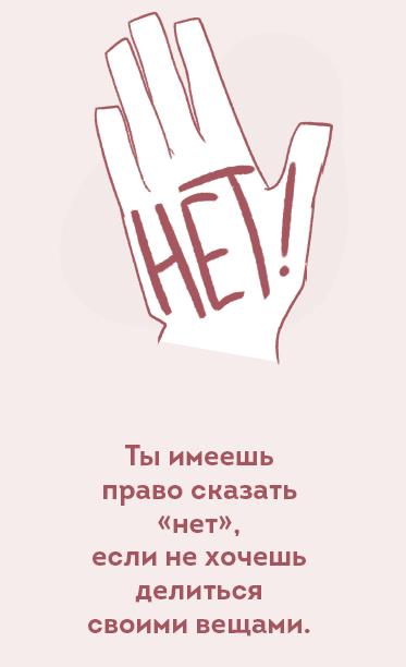 Ведь корень проблемы совсем не в том, о чем говорит мама: дело не в том, что ты жадный или плохо относишься к брату, и, возможно, тебе даже не жалко поделиться, просто у каждого из нас есть материальные границы: вещи, места, территория, которые мы считаем своими. Те, которыми мы распоряжаемся, о которых необходимо спрашивать у владельца. А он, в свою очередь, может разрешить или нет, и это никак его не характеризует, это его право. Кстати, только тот человек, который знает, четко понимает, что такое «мое», что значит владеть чем-то, способен уважать чужое: понятна ценность предмета, понятны чувства владельца – по аналогии с собой.