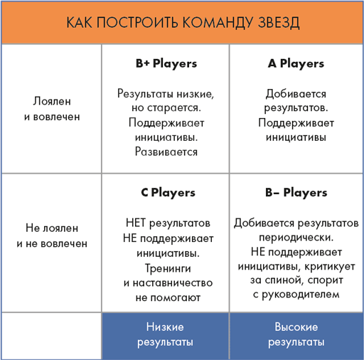 Системный взгляд на выстраивание эффективных командных коммуникаций дает концепция Эрика Херренколя, который в своей книге How to Hire A-Players вводит понятие первоклассных A-игроков – суперзвезд в составе команды, способных добиваться результата несмотря ни на что. Это локомотивы любых изменений и драйверы любого проекта, которые ищут не причину, чтобы отказаться, а возможность, чтобы решить задачу. Они всегда вовлечены, всегда лояльны, всегда результативны. Они – мечта любого руководителя.