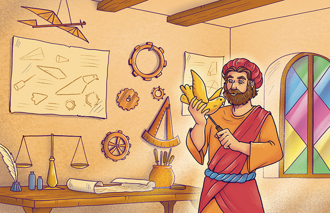 – Мы в древнегреческом городе Таренте, в мастерской учёного Архита, Чевостик. Видишь, как много на столах и на стенах разных приборов, шестерёнок, весов. Архит – изобретатель. Он очень занят. Сегодня первое испытание его нового изобретения – механического голубя.