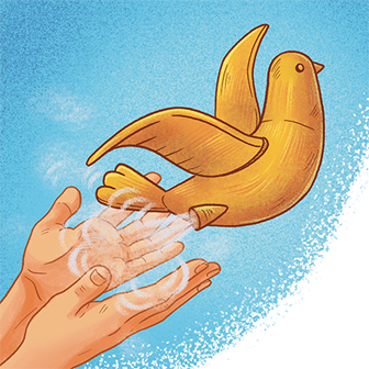 – Вижу, дядя Кузя! Он поднимает над головой деревянную птицу, что-то подкручивает, из птицы вырывается пар. Ой, полетел, полетел! Машет крыльями! Как он летит, на батарейках?