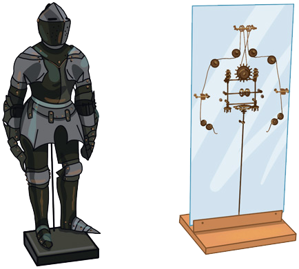 – Леонардо да Винчи нарисовал чертёж знаменитого автоматона – механического рыцаря, который должен был двигать руками, поворачивать голову и поднимать забрало шлема. Вот он, этот чертёж, на стене!