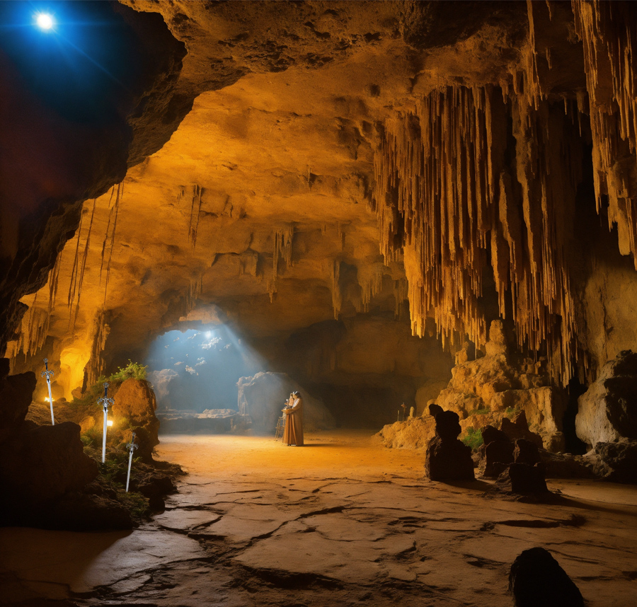 Там было на удивление светло, казалось, что сами стены испускают теплый свет. Слышался шум воды где-то вдалеке и с потолка свисали длинные сталактиты. Кое-где в камень были воткнуты мечи.