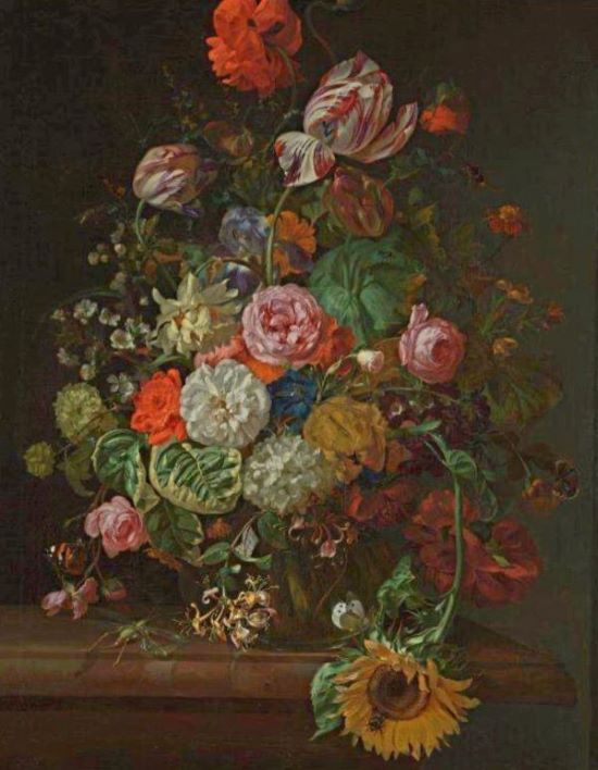 Фото Ирины Ходыкиной из личного архива, «Натюрморт из роз, тюльпанов, подсолнуха и других цветов в стеклянной вазе с пчелой, бабочкой и другими насекомыми на мраморном выступе», масло, холст, художник Ракель Рейш, 1710 год