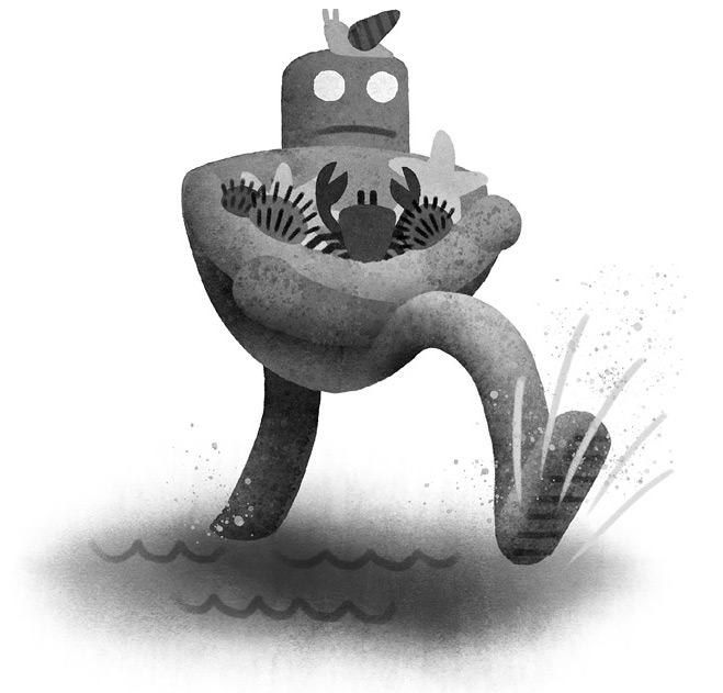 В электронном мозгу робота умещались тысячи программ, но самыми важными были инстинкты выживания. Когда к берегу подкатилась отравленная вода, инстинкты немедленно включились и потребовали, чтобы Роз поскорее вышла на сушу. Но тут за плеском волн послышались другие звуки: чей-то испуганный писк и плач. В общей суматохе детёныш выдры забрался на камень, который торчал на мелководье. Теперь он застыл от страха, глядя на ядовитое течение.