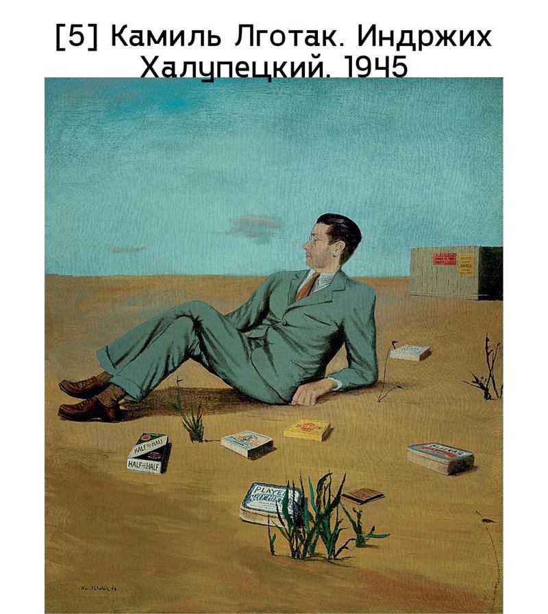 Что касается Чехословакии, то в первые послевоенные годы многие художники и критики, симпатизировавшие левым, также признавали новую историческую ситуацию, где роль искусства виделась им в построении демократического общества на социалистической основе. Однако именно левый радикализм стал причиной постоянного давления властей на критика Карела Тейге, главного теоретика сюрреалистических объединений (например, «Группы Ра»). Члены этого междисциплинарного коллектива – молодые писатели, фотографы и художники, как Йозеф Истлер, Вацлав Тикал, Вацлав Зикмунд, – видели в сюрреализме открытую систему, способную подстроиться, полагаясь на случай и эксперимент, под меняющиеся условия современной жизни. Пражскую «Группу 42» создали в ноябре 1942 года поэты, теоретики и художники, включая Франтишека Гросса, Франтишека Худечека и Камиля Лготака: общей темой для них стали ощущения и переживания человека в современном большом городе. Лготак был известен тем, что романтизировал belle époque и начальный этап технологической цивилизации: на его картинах можно видеть велосипеды, мотоциклы, воздушные шары и деревянные планеры, отражавшие ностальгию по заре современного мира. На его портрете критик Индржих Халупецкий (1946), оказавший большое влияние на группу, предстает одиноким человеком посреди пустынного ландшафта, окруженный лишь символами зарождающейся потребительской культуры [илл. 5]. Установление социализма сталинского образца после коммунистического переворота в феврале 1948 года прервало активность независимых от властей групп, и Халупецкий в своем эссе Интеллектуал при социализме выразил глубокое разочарование искажением реальности внутри «системы беспримесной идеологии».