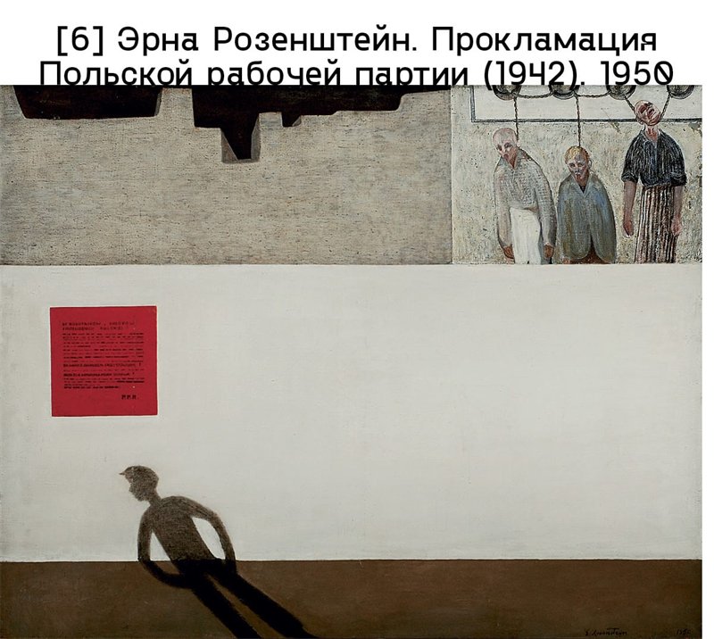 Разумеется, художники обращались к невиданным по своему масштабу человеческим трагедиям и материальным разрушениям, вызванным Второй мировой войной. Шок от Холокоста, развернувшегося в том числе на польских землях, отразился в творчестве Владислава Стшеминского, чья серия коллажей Моим друзьям-евреям (1945–1947) включала фотографии из Лодзинского гетто и копии его абстрактных рисунков военного времени, со стихотворными комментариями на обороте. Ужасы войны стали темой картины Ядвиги Мазярской Статуя циркулирующей власти (1949): разрозненные части тела выступают из всеохватывающей темноты, всё решено в черно-белом цвете и напоминает жуткие фотографии в газетах, из которых мир узнал о трагедии концлагерей. Эрна Розенштейн, бежавшая из Львовского гетто и скрывавшаяся до конца войны, поведала о своих страданиях в полотнах, которые изображали кричащих людей, части тел и процесс дегуманизации – но также напоминали о необходимости сопротивления, как Прокламация Польской рабочей партии (1942) [илл. 6].