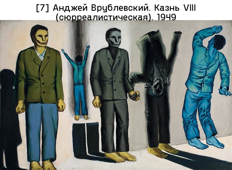 Установление новых границ Польши на востоке и западе – следствие Ялтинских соглашений между державами-победительницами – привело к массовому перемещению населения. Уроженец Вильно Анджей Врублевский, покинувший родные места и осевший в Кракове, учился там в Академии изящных искусств и активно участвовал в художественной жизни как посредством своих текстов, так и картин, пытаясь передать масштаб военной трагедии. Часто пользуясь обеими сторонами холста, он стал основоположником особого извода реализма, сочетая его с заимствованиями из сюрреалистической и абстрактной живописи. На картинах Врублевского мы видим жертв войны и выживших; в серии Казни (1949), посвященной зверствам в отношении мирных граждан, погибшие изображены синими, что типично для художника, и одеты в его собственный пиджак [илл. 7]. Эти фигуры присутствуют не только в сценах убийств, но и в повседневных ситуациях, когда они общаются с родственниками: горем и чувством потери проникнута немалая часть работ Врублевского. Это особенно верно как для ранних картин, так и для самых поздних, созданных незадолго до смерти в двадцатидевятилетнем возрасте (1957): художник один, без спутников совершил восхождение в Высокие Татры и нашел там свою смерть. Однако в начале 1950-х годов, хоть это и длилось недолго, он был вовлечен в дискуссию о социальной ответственности искусства и пытался работать в стиле социалистического реализма.