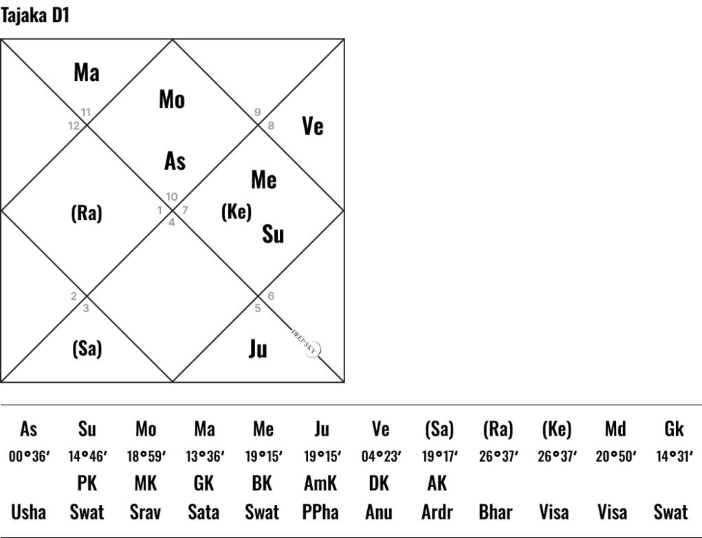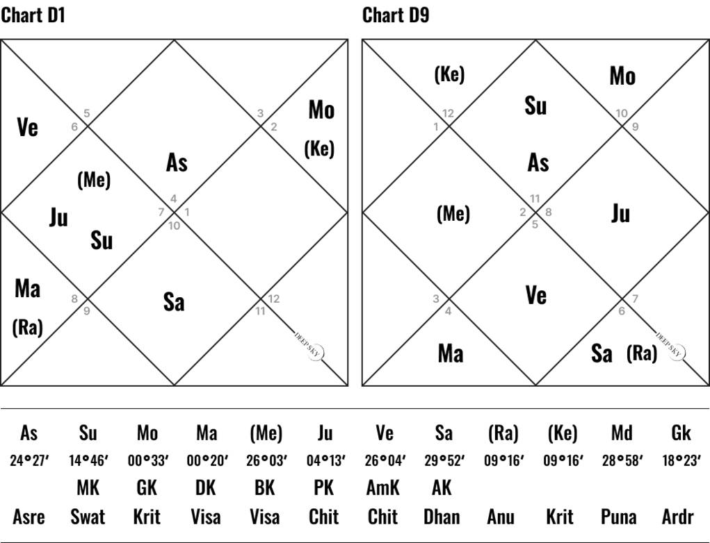 В гороскопе Д—1 (основная натальная карта), в гороскопах Д—9 (дополнительный гороскоп к основной карте) и Д—4 (карта территории) Венера занимает особое положение. Венера формирует во всех трех гороскопах королевскую комбинацию Раджа Йоги и во всех трех картах Венера связана с одиннадцатым домом союзов и объединений.