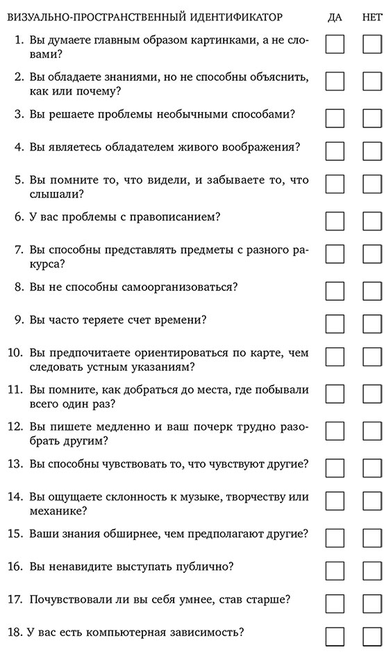 Помимо инструкции по сборке книжных шкафов, однозначного теста или обследования на визуальное мышление не существует (пока), но «Визуально-пространственный идентификатор» Линды Сильверман, который она и ее команда в Денвере разрабатывали на протяжении многих лет, очень хорошо проводит различие между теми, кого Сильверман называет мыслящими в «аудиальной последовательности» (основываясь на языке), и людьми с «визуально-пространственным» мышлением (опирающимися на изображения). Если вас интересует, к какой части спектра относитесь вы, уделите время ответам на восемнадцать вопросов «Визуально-пространственного идентификатора», приведенного ниже.