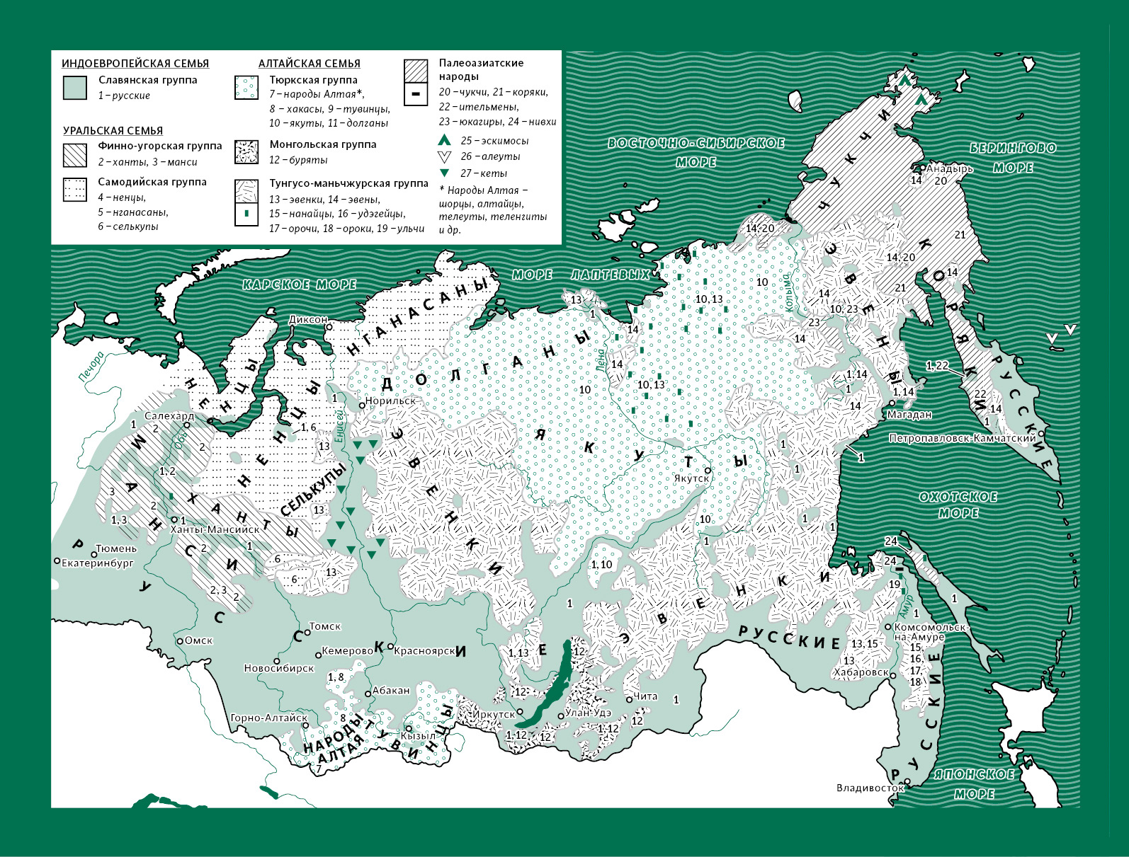 В соответствии с этнолингвистической классификацией, коренные народы Сибири и Дальнего Востока являются представителями следующих языковых семей и групп[3].