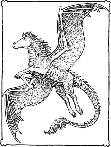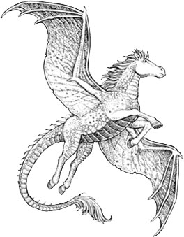 Крылатая, покрытая чешуей лошадь, чаще зеленого или коричневого окраса и с черным брюхом, настолько сильная и красивая, что от ее вида перехватывает дыхание. Некоторые лунмы проживают жизнь, ни разу не коснувшись земли. Эти обитатели неба используют дождевые облака, чтобы искупаться. Они медленно пролетают сквозь тучу, расправив чешуйчатые крылья. Лунма – единственное существо, которое рождает в воздухе. Мать взлетает как можно выше, тогда у жеребенка, когда он вывалится из ее утробы, будет достаточно времени, чтобы раскрыть крылья. К лунмам следует относиться с осторожностью: лишь немногие устанавливают прочную связь с человеком. Впрочем, этот человек может однажды утром обнаружить, что ночью у него отгрызли палец или кусок уха, потому как приручить лунму невозможно.