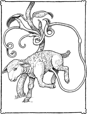 Баранец, известный также как живорастущий ягненок, растет на стебле, с которым соединен пуповиной. Он достигает одного фута[1] в высоту, его кожа зеленая, а шерсть белая. Если он съест всю траву, до которой дотянется со стебля, то может погибнуть от голода, а с ним – и материнское растение. Поэтому многие на Архипелаге носят с собой семена и, если видят побег баранца, засевают все вокруг травой. Баранец добровольно отдает шерсть тому, кому доверяет. Из этой шерсти изготавливают самую мягкую в мире ткань, которая не снашивается сотню лет и от которой исходит легкий аромат земли.
