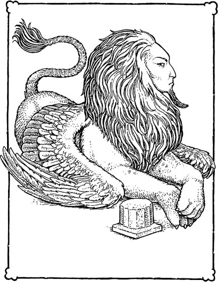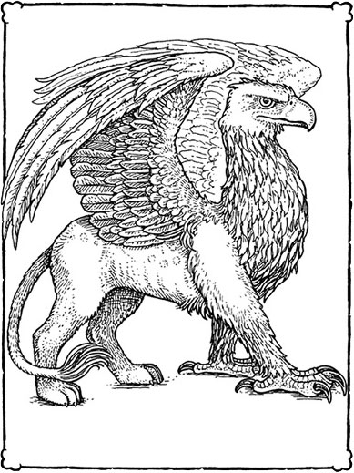 У грифонов тело, хвост и задние ноги льва, а голова, крылья и когти на передних лапах – как у орла. Хотя грифоны обычно отмалчиваются, они способны освоить любой человеческий язык в течение нескольких дней. Когда они вырастают, размах их крыльев достигает такой ширины, что под ними может спрятаться ребенок. Грифон больше, чем любое другое существо, зависит от гримура в почве и воздухе и является одним из самых чудесных волшебных созданий. (Дополнение от Фрэнка Орита: «За последние пять лет грифоны стали встречаться реже. Причина неясна, но, возможно, это связано с истощением гримура. Сейчас их статус таков: вид близок к исчезновению».)