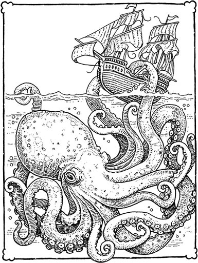 Д ревнейшее из морских существ. Останки первых кракенов относятся к меловому периоду, а значит, они делили Землю еще с тираннозавром рексом. Количество щупалец варьируется от восьми до сорока шести в зависимости от подвида. Особенно опасны во время приступов голода: рассказывают о случае, когда кракен за один день съел около четырехсот моряков. Водоворот, создаваемый их щупальцами, может затянуть на морское дно корабли огромных размеров. Кракены, как правило, не мигрируют и остаются в той области моря, где родились, поэтому моряки, имеющие в своем распоряжении точные карты, могут избежать встречи с ними. Но тем, кто плывет наугад, остается полагаться только на себя.