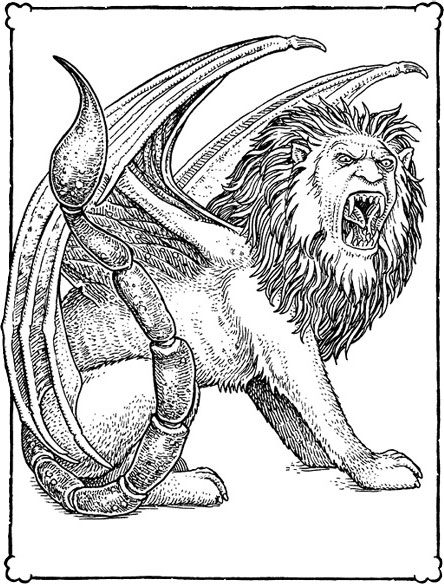 У мантикоры хвост скорпиона, лицо человека, зубы и тело льва, а характер как у самодовольного политика. Некоторые подвиды крылаты. Мантикоры, как и каркаданны, относятся к тем немногим существам, которые нападают на человека, даже если не нуждаются в пище. Они лгут и убивают ради удовольствия. От них пахнет разложением.