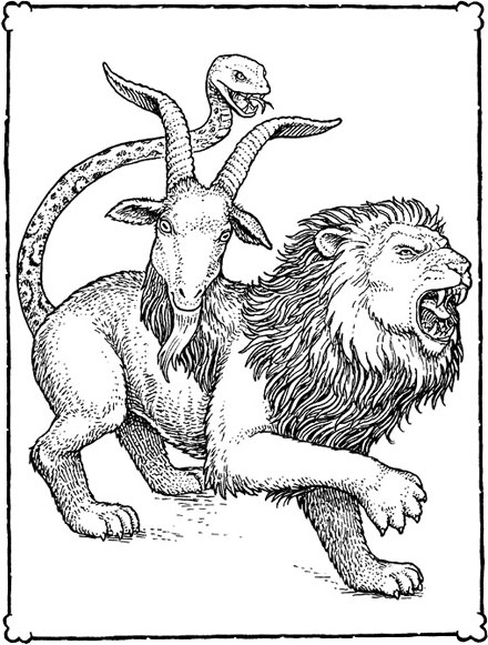 Существо, похожее на льва, но у него есть еще две головы: козлиная на спине и змеиная на конце гибкого хвоста. Каждая из трех голов обладает собственным мозгом, нервной системой и личным мнением. Это приводит к полному хаосу, поскольку головы редко могут договориться друг с другом о том, что делать дальше.