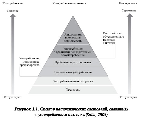 На Рисунке 1.1 показан спектр патологических состояний, связанных с употреблением алкоголя. Уровень употребления алкоголя соответствует степени риска: от состояний предболезни, включая рискованное употребление (risky use), проблемное употребление (problem drinking), до расстройств, включая употребление с вредными последствиями (harmful use), злоупотребление (alcohol abuse) и синдром зависимости (alcohol dependence) (Saitz, 2005). К условно здоровым состояниям относится воздержание от употребления (abstinence), не представляющее риск для здоровья (отсутствие употребления = отсутствие риска), а также такой уровень употребления, при котором риск оценивается как низкий (low-risk use).