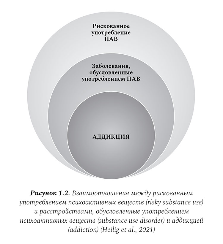 Три термина – (1) аддикция, (2) расстройства, обусловленные употреблением ПАВ (substance use disorder – DSM-5) и (3) употребление с вредными последствиями и синдром зависимости (МКБ-10 и МКБ-11) – пересекаются. Кроме того, эти термины отражают последовательные изменения клинической тяжести состояния, возникшего в результате употребления ПАВ. Иллюстрации (Рисунок 1.1 и Рисунок 1.2) показывают, что не у всех, кто употребляет «рискованно», есть расстройство употребления ПАВ, так же как не у всех, кто страдает расстройством употребления ПАВ, есть аддикция (Heilig et al., 2021). Следует отметить, что границы между расстройством и аддикцией размыты.