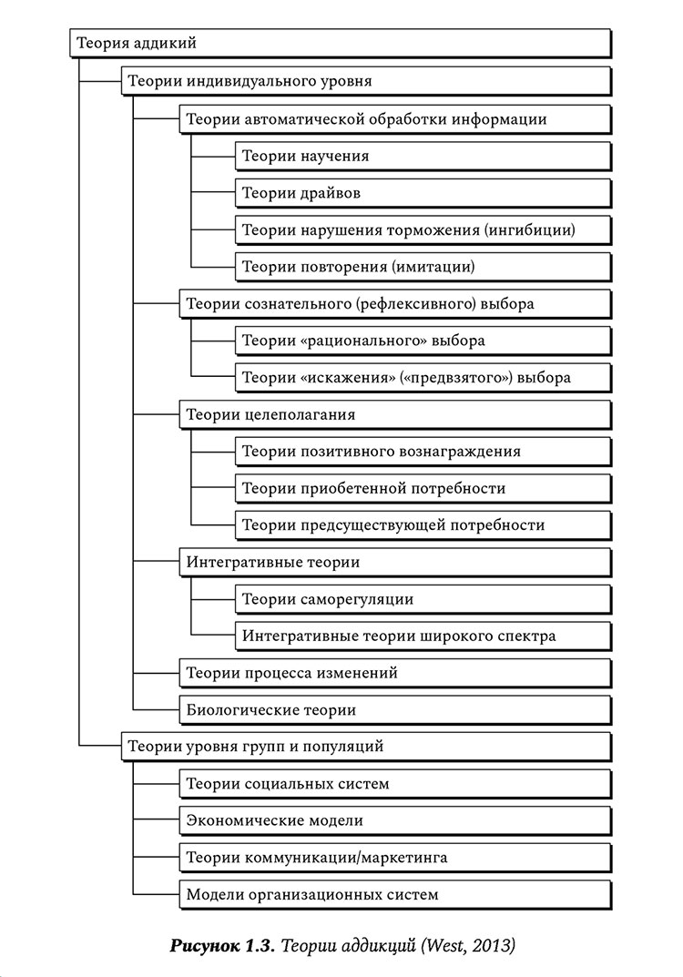 В данной книге мы не будем подробно описывать все известные теории, их аргументы, ограничения и применение в клинической практике, так как они подробно описаны в книге (West, 2013), но предлагаем рассмотреть основные концептуальные представления аддикции.