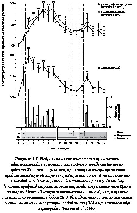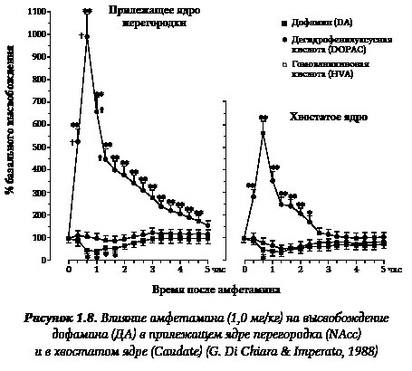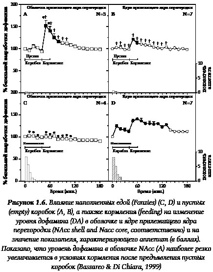В основе биомедицинских теорий лежат результаты экспериментальных исследований на животных, свидетельствующих об участии дофаминергического пути в ответе на натуральные и фармакологические стимулы награды (Ahmed, Koob, 2005; Cummings, 2000; Di Chiara, 2002; Di Chiara et al., 2004; Franken et al., 2005; Goldstein, Volkow, 2002; Kim et al., 2011; Kovacic, 2005; Volkow et al., 2002), а также вовлечении префронтальной коры в регуляцию аддиктивного поведения (Goldstein et al., 2004; Peters et al., 2013). Таким образом, активизация одних и тех же структур головного мозга в ответ на натуральные стимулы и в ответ на воздействие ПАВ показывает, что механизм формирования аддикции затрагивает систему, которая обусловливает поведение, направленное на выживание. Причем интенсивность влияния ПАВ на дофаминергическую систему более выраженная, чем у натуральных стимулов. На рисунках ниже показаны результаты исследований с применением методики микродиализа (метод получения и анализа состава внеклеточной жидкости из ткани или органа в процессе его функционирования (Харитонова и др., 2020)) для мониторинга передачи дофамина в прилежащем ядре перегородки (NAcc) во время еды (Рисунок 1.6), секса (Рисунок 1.7) и введения амфетамина (Рисунок 1.8).