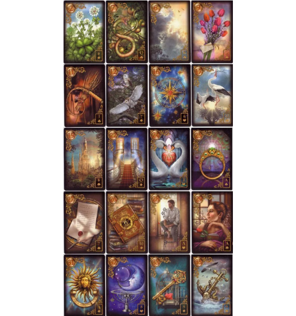 (Gilded Reverie Lenormand by Giro Marchetti – красиво оформленная карточная игра для коллекционеров. К сожалению, коллекционное издание сейчас больше не издается.)