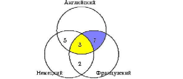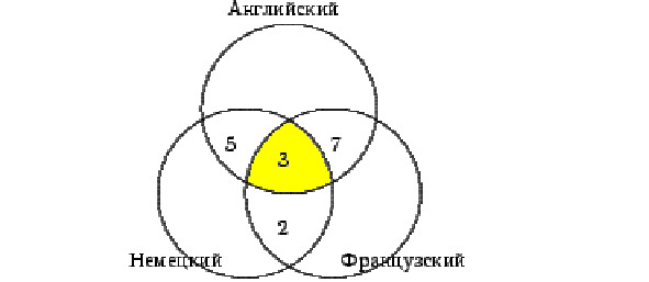 Выразим условие этой задачи графически. Обозначим одним кругом тех, кто знает английский, другим кругом – тех, кто знает французский, и третьим кругом – тех, кто знают немецкий.