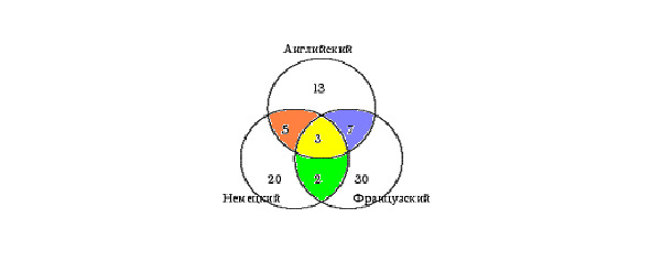 Определим теперь, сколько человек владеют только одним из перечисленных языков. Немецкий знают 30 человек, но 5+3+2=10 из них владеют и другими языками, следовательно, только немецкий знают 20 человек. Аналогично получаем, что одним английским владеют 13 человек, а одним французским – 30 человек.