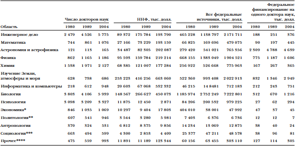 ИСТОЧНИКИ: Early Release of Summary Statistics on Science and Engineering Doctorates, NSF, March 1990. Federal Funds for Research and Development, Federal Obligations for Research by Agency and Detailed Field of Science and Engineering: Fiscal years 1970–2003, NSF.