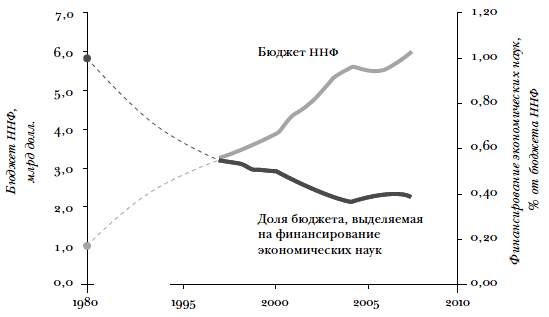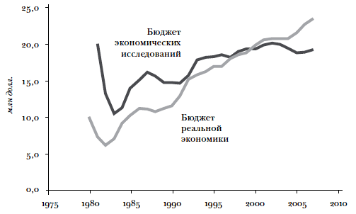 Заключительные замечанияДанная глава написана с оборонительной позиции. То, что результаты фундаментальных исследований в экономике малоизвестны за пределами экономической сферы, представляется достаточно очевидным. Например, уровень финансирования фундаментальных исследований в экономике остается постыдно низким: финансирование исследовательской работы среднего доктора наук в экономике составляет лишь ничтожную долю аналогичного финансирования в других науках (см. табл. 0.1 и рис. 0.1). Средства, выделяемые Национальным научным фондом (ННФ) на экономику, не увеличиваются в течение десятилетий, несмотря на постоянный рост общего бюджета Фонда (см. рис. 0.2 и 0.3). Собственно, в реальном исчислении финансирование экономических исследований ННФ с начала 1990-х гг. застыло на одном уровне, хотя финансирование других наук стабильно и заметно возрастает. Можно задаться вопросом: не получают ли фундаментальные исследования в экономике финансирования из других источников, помимо ННФ? К сожалению, на экономику не распространяется действие хорошо финансируемых и имеющих большой штат программ, осуществляемых государственными учреждениями, в то время как многие из этих учреждений оказывают значительную поддержку другим наукам. Для большей наглядности отметим, что ежегодно другим наукам выделяют больше средств, чем экономика получала за всю историю человечества, и такой перекос финансирования существует на протяжении десятилетий.