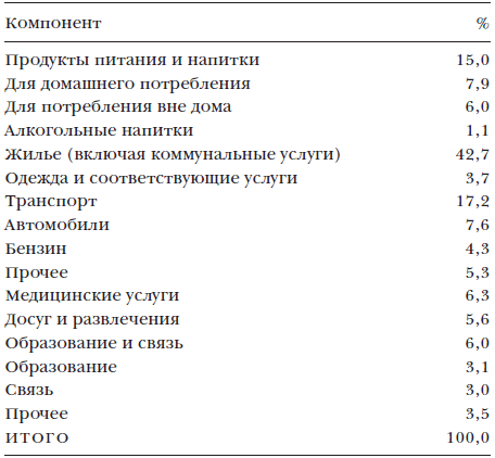 Большинство традиционных индексов потребительских цен, включая американский CPI, основаны на измерении цен при неизменном относительном весе большинства товаров, когда относительный вес различных статей расходов считается неизменным за какой-либо базовый период. В таб. 2.1 приводится относительный вес весьма широких категорий товаров за период с 2006 г.; Бюро статистики труда (БСТ) определяет этот относительный вес на основе изучения расходов, в ходе которого устанавливается, сколько денег потребители тратят на различные типы товаров и услуг. Например, на очень широком уровне обобщения эти веса составляют 15,0 % для продовольствия, 6,3 % для медицинских услуг, 42,7 % для жилья и 17,2 % для транспорта. Разумеется, каждая категория включает в себя тысячи конкретных товаров; например, яблоки определенного сорта, размера и качества входят в подкатегорию яблок, та входит в подкатегорию свежих фруктов, та же, в свою очередь, включается в подкатегорию свежих фруктов и овощей, которая входит в подкатегорию продуктов питания для домашнего потребления, и т. д.