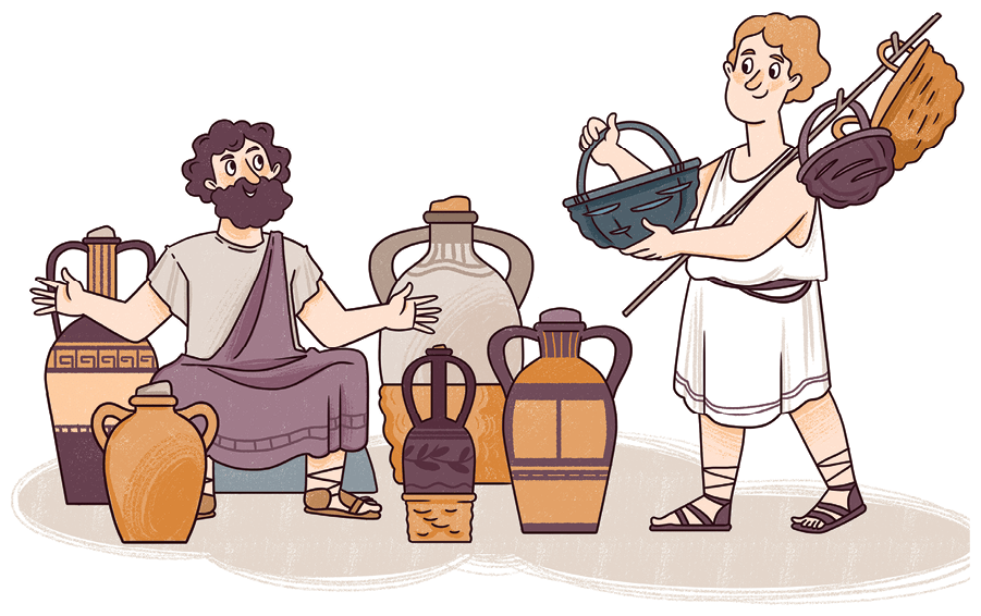 ОБЫЧНО ОДНО ПОСЕЛЕНИЕ НЕ МОГЛО ОБЕСПЕЧИТЬ СЕБЯ ВСЕМ НЕОБХОДИМЫМ. ПРИХОДИЛОСЬ ЛИБО ОБХОДИТЬСЯ ТЕМ, ЧТО ЕСТЬ, ЛИБО ДРУЖИТЬ С СОСЕДЯМИ, ЧТОБЫ ОБМЕНИВАТЬСЯ С НИМИ РАЗНЫМИ ТОВАРАМИ. НАПРИМЕР, У КОГО-ТО ПОЛУЧАЛИСЬ КАЧЕСТВЕННОЕ ОЛИВКОВОЕ МАСЛО И ШЕРСТЬ, А КТО-ТО ВЫПЕКАЛ ВКУСНЫЙ ХЛЕБ И ПЛЕЛ ПРОЧНЫЕ КОРЗИНЫ.