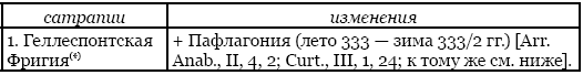 Подавляющее большинство сатрапий, вошедших в состав державы Александра, представляло собой прежние сатрапии Ахеменидов, сохраненные им и в новых обстоятельствах. Если не считать Сирию, – которая, как уже говорилось, хотя сперва и была разделена македонским царем на две самостоятельные провинции, но спустя несколько лет была вновь им восстановлена, – можно говорить лишь о трех случаях упразднения им, да и то со временем, персидских сатрапий: это Тапурия, которая с добавленной к ней ранее областью мардов была полностью поглощена провинцией Парфия и Гиркания, а также сатрапии Арахосия и Гедросия, из которых македонский царь в конце своего правления создал путем объединения одну новую провинцию. Из факта сохранения Александром бывших персидских сатрапий, однако, вовсе не следует, что они продолжали оставаться в его державе в своих прежних границах: большинство из них подверглось определенным территориальным изменениям (см. табл. выше).