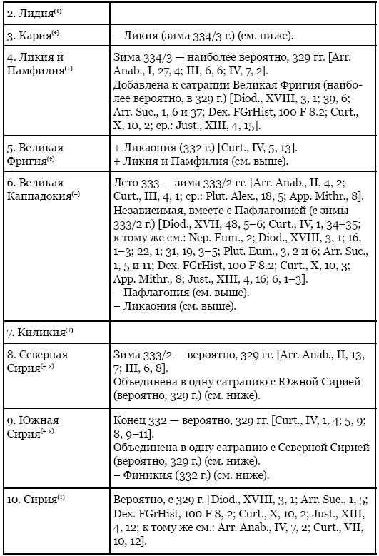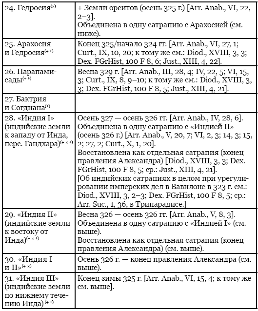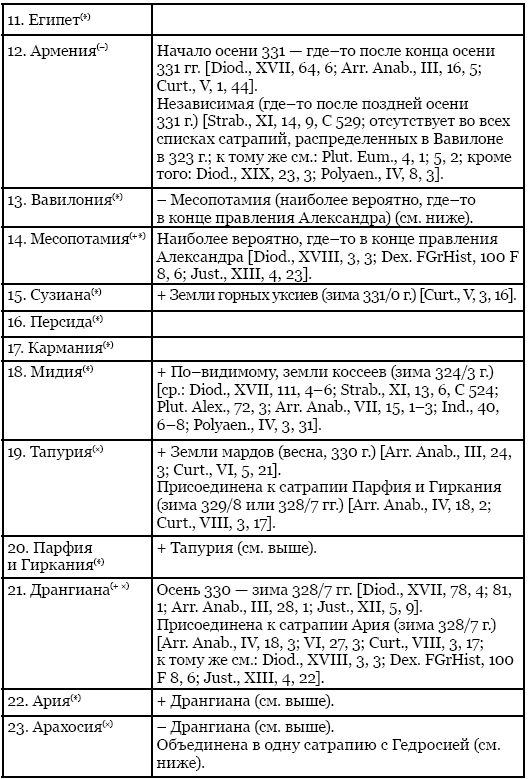 Насколько можно судить, за весь период до конца правления Александра в составе его азиатской державы насчитывались в целом 31 сатрапия, из которых ко времени его смерти остались 21. Прочие сатрапии со временем либо вышли из-под контроля македонян, как Великая Каппадокия (с Пафлагонией) и Армения (см. ниже), либо были упразднены Александром: одни из них были присоединены к соседним провинциям, оказавшись тем самым ими поглощены, как Тапурия, Ликия и Памфилия, а также, по всей вероятности, Дрангиана[18], другие – объединены, следствием чего было образование новых по своему качеству сатрапий. К числу последних можно отнести Сирию, которая, надо полагать, была вначале разделена Александром на две провинции – северную и южную, но потом восстановлена им в границах прежней персидской сатрапии «Заречье» (правда, уже без Финикии)[19], а кроме того, провинцию Арахосия и Гедросия: после того, как посты глав Арахосии и Гедросии, крупных и при этом равнозначных сатрапий, оказались почти одновременно вакантными, македонский царь объединил их, поставив под управление одного лица[20].