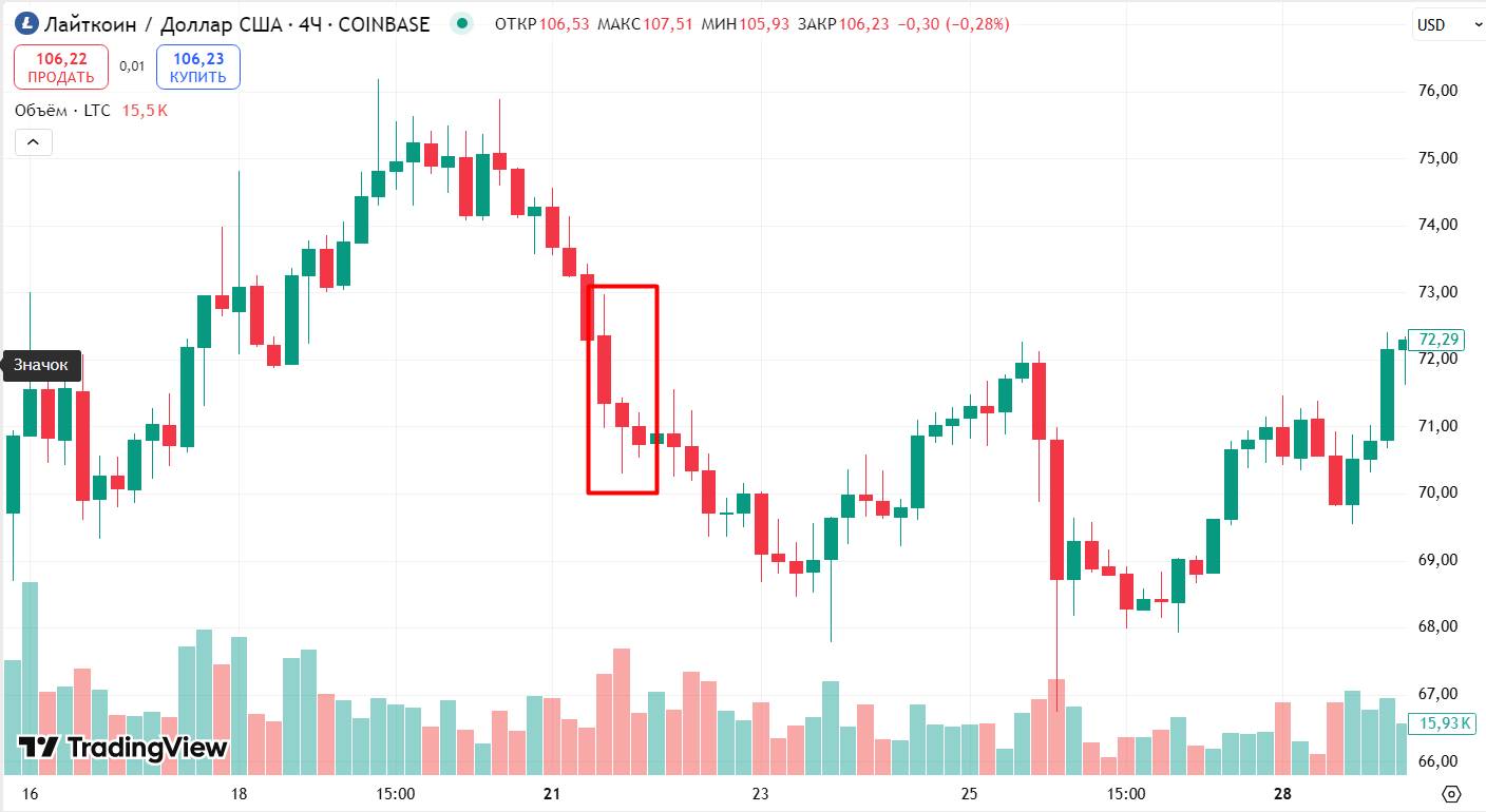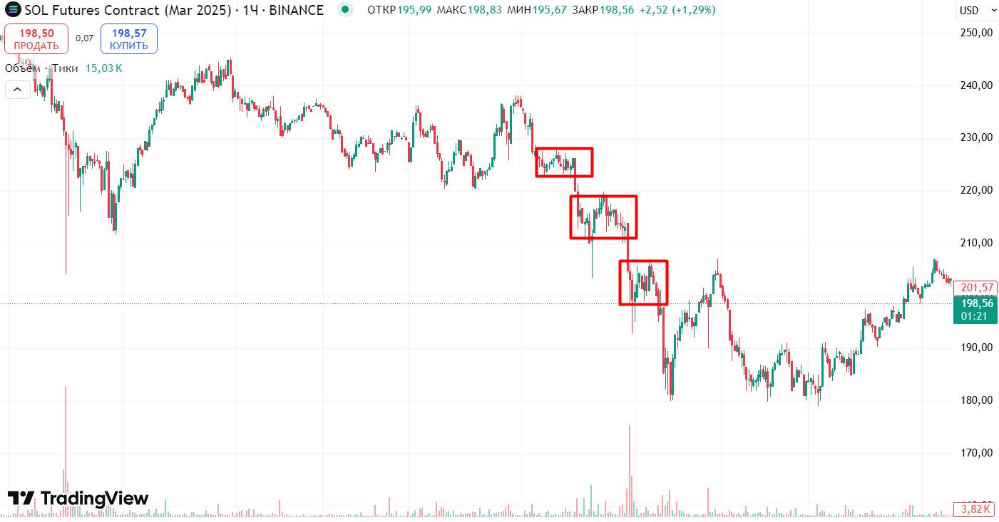 Первым и наиболее характерным паттерном медвежьего рынка является "нисходящий лестничный паттерн". Он представляет собой последовательность снижающихся ценовых максимумов и минимумов, где каждый новый отскок цены оказывается слабее предыдущего. Этот паттерн формируется из-за постепенного истощения покупательской способности: каждая новая попытка быков (покупателей) развернуть тренд встречает все более сильное сопротивление медведей (продавцов).