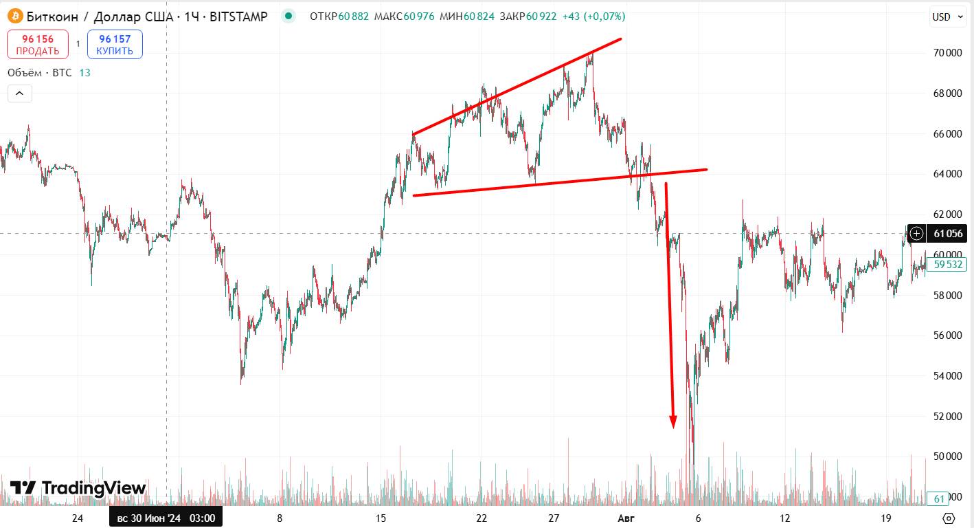 Характерным для медвежьего рынка является паттерн "расширяющийся треугольник" – фигура, в которой колебания цены становятся все более широкими. Этот паттерн отражает растущую неопределенность на рынке: каждое движение цены становится более резким и непредсказуемым. Расширяющийся треугольник часто формируется в периоды максимальной паники, когда участники рынка теряют ориентиры для оценки справедливой стоимости актива.