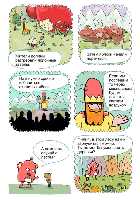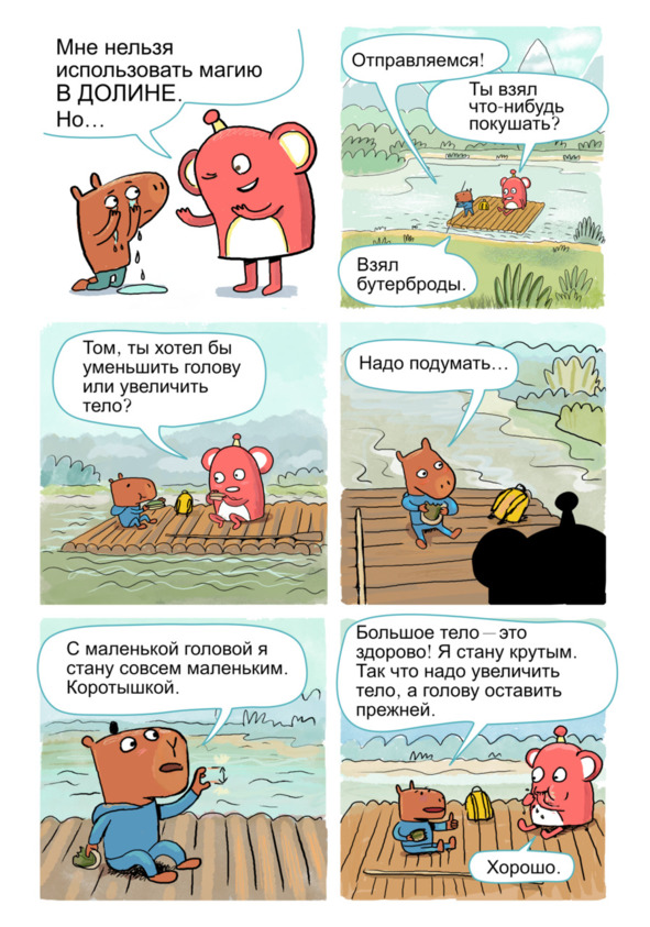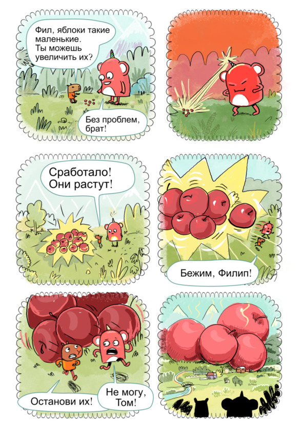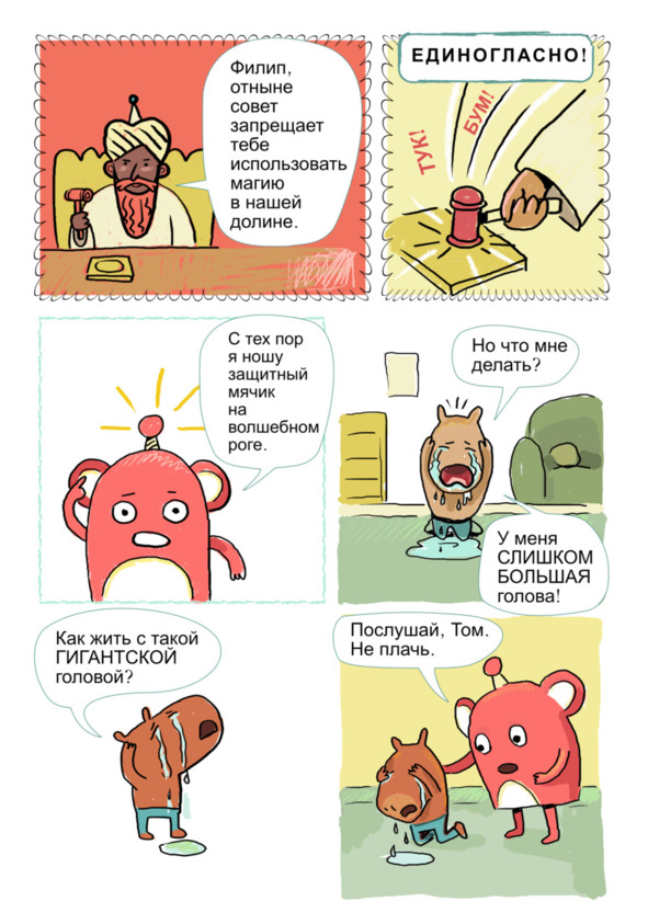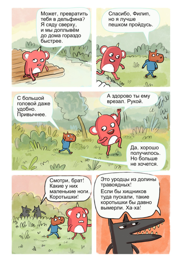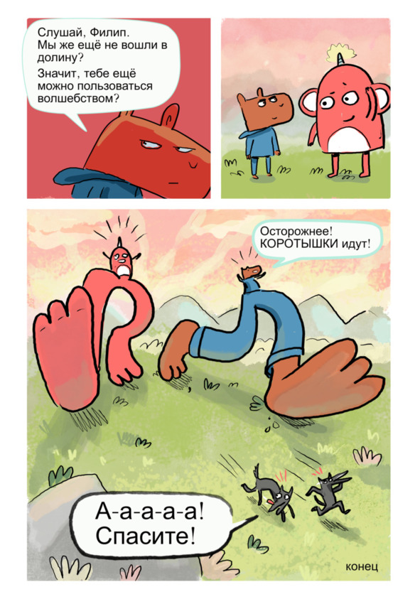 Комикс читал 10-летний Лёвка. По его мнению, идеально подходит для детей 5—10 лет, особенно, которые ходят в садик или школу, чтоб они не обращали внимания на всяких дураков (я извиняюсь, прямая цитата). Засыпал меня вопросами – откуда взялся Фил, кто в какой долине почему оказался, что было до этого, а что потом, и кто и откуда. Так он разошёлся, что стал сочинять уже вместо вас и, говорят, по сей день придумывает ответвления сюжета)