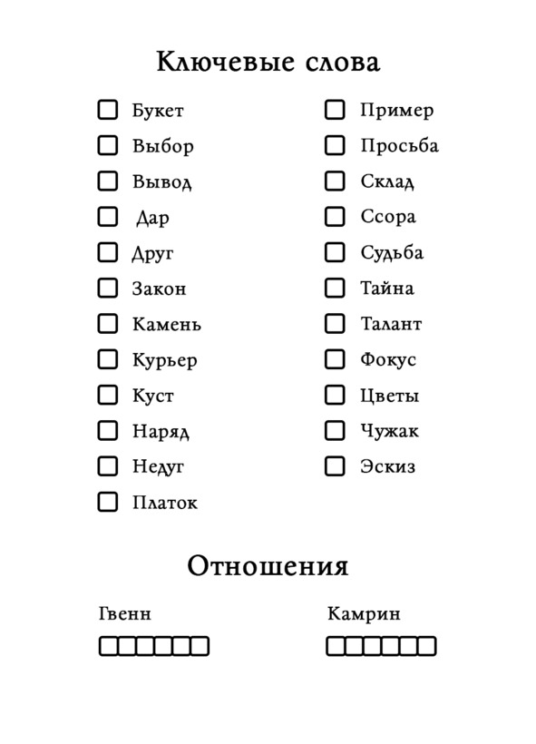 Для игры тебе потребуются карандаш или гаджет с приложением для заметок. Когда книга попросит отметить ключевое слово, запиши его или закрась квадрат напротив него в разделе «Ключевые слова». Когда книга попросит изменить отношение персонажа, запиши новое значение или закрась квадрат в соответствующей шкале в разделе «Отношения». Если отношение ухудшилось, зачеркни закрашенный квадрат или сотри карандаш ластиком.