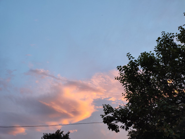 Это бесконечное небо, в сполохах несочетаемых сочетаний. Как будто бы с другой стороны облаков, кто-то зажег огромный фонарь, и он подсвечивает невесомые белоснежные пряди, разбросанные на голубом фоне, в различные оттенки розового, серого, иногда малинового, а бывает даже и оранжевого. Красиво!