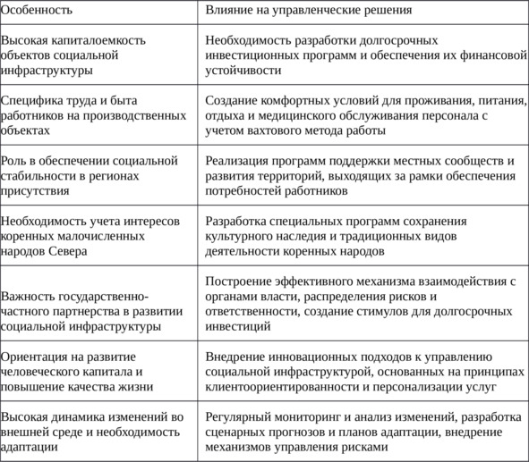 2. К числу ключевых особенностей относятся высокая капиталоемкость объектов социальной инфраструктуры, необходимость учета специфики труда и быта работников на производственных объектах, роль в обеспечении социальной стабильности в регионах присутствия, необходимость учета интересов коренных малочисленных народов Севера.
