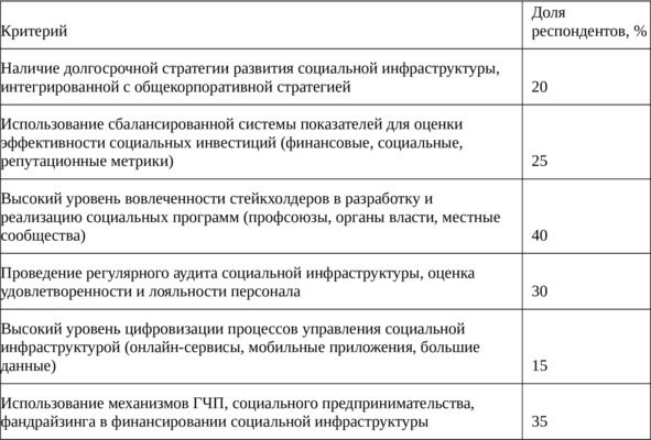 Результаты анкетного опроса руководителей кадровых служб 20 крупнейших нефтегазовых компаний России, проведенного автором, показали, что, несмотря на существенный прогресс в последние годы, уровень зрелости систем управления социальной инфраструктурой в отрасли остается недостаточно высоким (таблица 1.3.1). Почти половина респондентов (45%) оценивает текущую эффективность использования объектов социальной инфраструктуры как низкую, указывая на отсутствие комплексной методологии оценки социального и бизнес-эффекта. Лишь 30% опрошенных подтвердили наличие в их компаниях регулярной практики проведения социального аудита и оценки удовлетворенности работников корпоративными социальными программами.