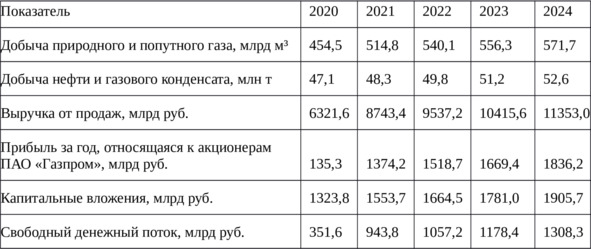 В таблице 2.1.1 представлены ключевые показатели деятельности ПАО «Газпром» за период 2020—2024 гг.
