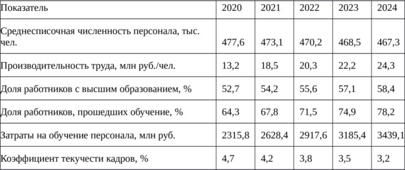 Таблица 2.1.3 – Показатели эффективности использования человеческих ресурсов ПАО «Газпром» за 2020—2024 гг. [составлено автором по данным годовых отчетов компании]