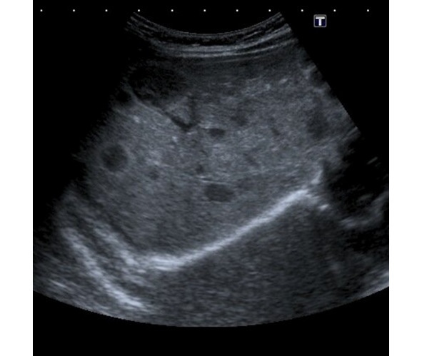 Fig. 20 Ultrasound examination of multiple hemangioma of the liver. Multiple round foci of reduced echogenicity are noted.