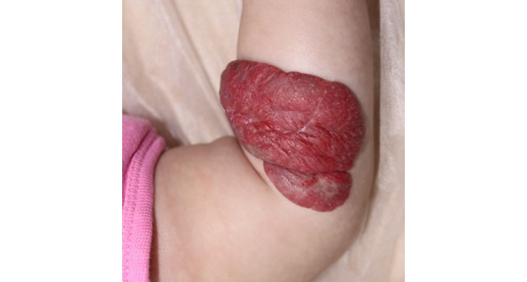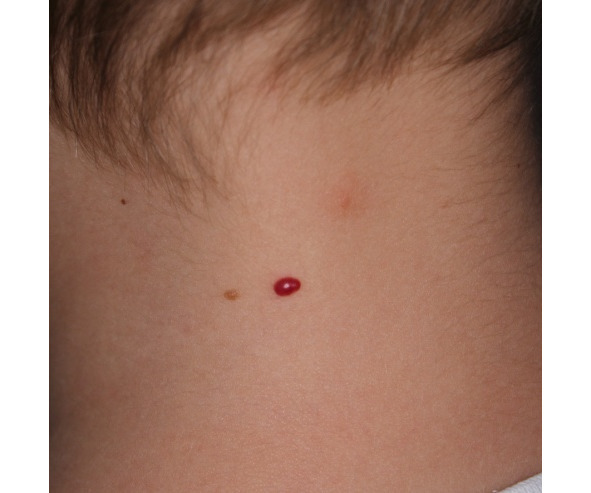 NICH hemangiomas are characterized by the appearance of a low cylinder (like a “washer”), protruding quite evenly above the surface of the skin, dense upon palpation, on the surface of which venulo- and telangiectasias are determined; the classic variant of infantile hemangiomas – red papules – are not determined on the surface of the tumor. After birth, the tumor remains unchanged (NICH hemangioma).