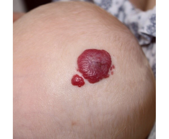 Pyogenic granuloma is characterized by bleeding and ulceration. After bleeding and crust falling off, it may become smaller, but usually grows again, already with a larger base and a more dome-shaped raised part. Most often, pyogenic granuloma appears at the age of 3—7 years and only in 12% – in the first year of life. Pyogenic granuloma most often affects the skin (88.2%), less often – mucous membranes (11.8%). It occurs on the head and neck in 62% of cases, on the trunk – in 20%, on the upper limbs – in 13%, on the lower limbs – in 5%.